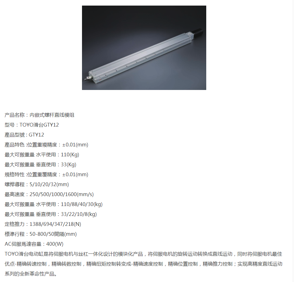 TOYO內(nèi)嵌式螺桿直線模組GTY12